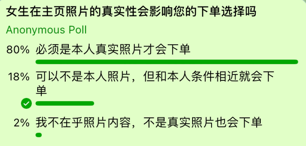 91uber上周在官方tg群 里进行了一次关于客户体验的投票调查,其中我们询问了“女生在主页的真实照片是否会影响客人的下单选择”,有80%参与投票的狼友都表示必须是女生本人的真实照片才会下单,由此可见大家都希望自己在网上看到的照片都是真实的,下单之后见到的女生和照片上是一样的。这也是91uber这次大力推进认证女生功能的主要原因。